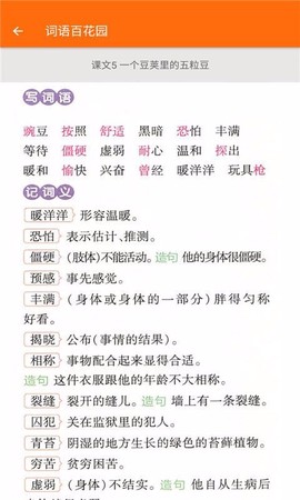 3、词语学习板块叫“词语百花园”,这名字起得就很有灵性。里面把词语学习分成了记词义、写词语好几个关卡,关键的字词还用不同颜色高亮,记起来特别快,跟玩游戏闯关似的。