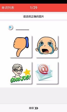 4、在学习界面,仔细查看单词拼写,点击喇叭图标听取发音,并通过点击相应按钮继续学习下一个单词。