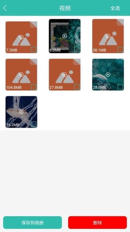 4、进入视频模块,查看每个视频的详细信息,快速选择不需要的进行删除,将有用的视频保存到相册。