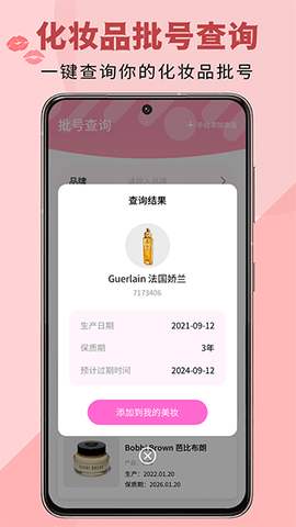 2. 快速查询批号,迅速了解产品的生产日期及保质期限,让您与过期化妆品说再见。